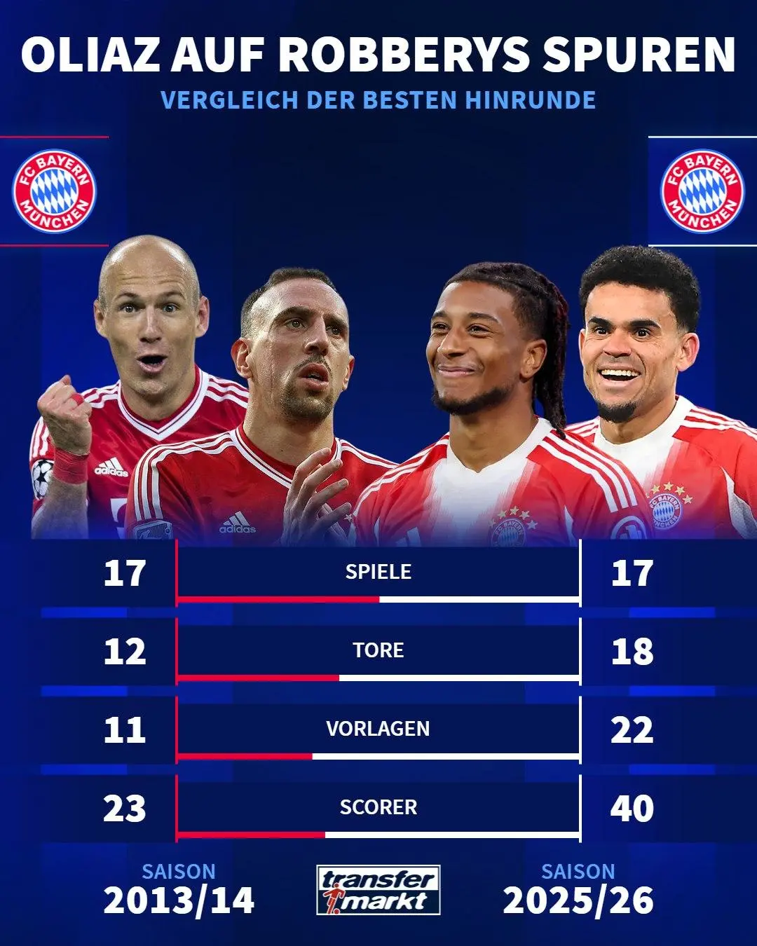 虎扑01月16日讯 根据德国转会市场的统计,迪亚斯和奥利塞在上半赛季的德甲联赛合计参与了40个进球(18球22助),成为了赛事历史单赛季前半程参与进球最多的边锋组合。